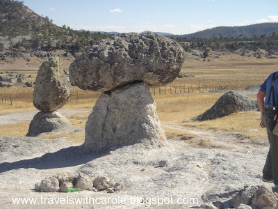 Located in Parque Natural Barrancas del Cobre, the Valley of the Mushrooms/Valle de Ongos area is named for a group of colossal mushroom-shaped rocks found here. The rock formations where sculpted by erosion of the volcanic and sedimentary rock layers, producing some intriguing and precariously balanced rocks. It reminds me of a Salvador Dali painting.| Valley of the Mushrooms/Valle de Ongos in Creel, Mexico |